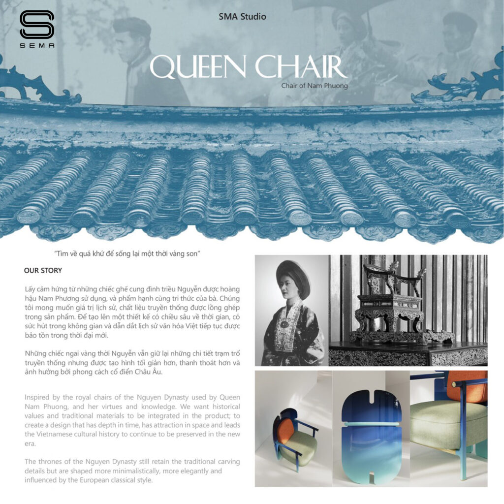 Inspired by the royal chairs of the Nguyen dynasty and the noble beauty of Empress Nam Phuong, the Nam Phuong – Queen Chair is a symbol of the unique blend between history and modern design. This product is not merely a chair, but it carries the story of the virtues and noble character of Vietnamese women, intertwined with the regal spirit of the feudal era.